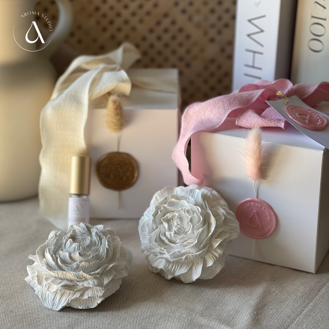 A peça em gesso de peónia é enviada dentro de uma caixa branca (igual às imagens), com lacre e uma flor seca, uma fita e um pequeno cartão personalizado (mensagem: "para uma pessoa especial" preso com um alfinete dourado. Tamanho: 10 cm Altura x 10 cm de largura A opção da caixa está sempre incluída, quer escolha a opção com frasco de perfume concentrado ou sem frasco de perfume concentrado. |