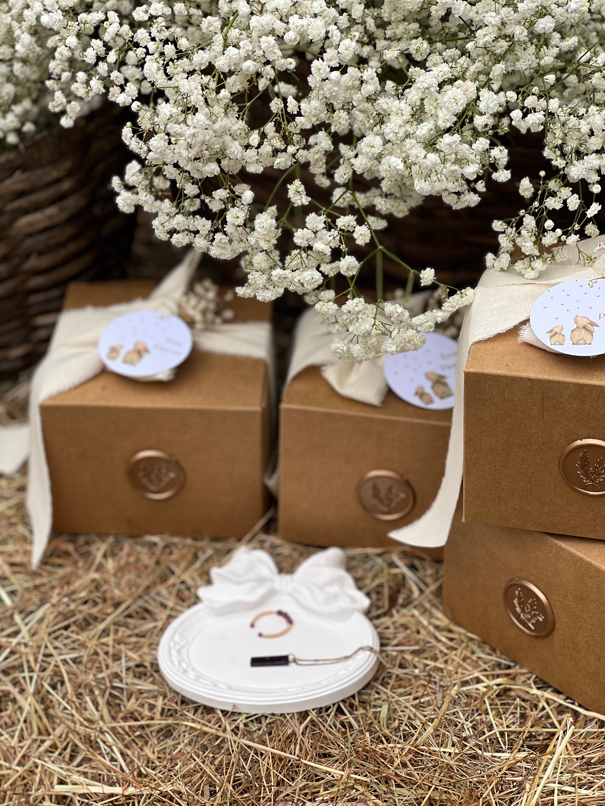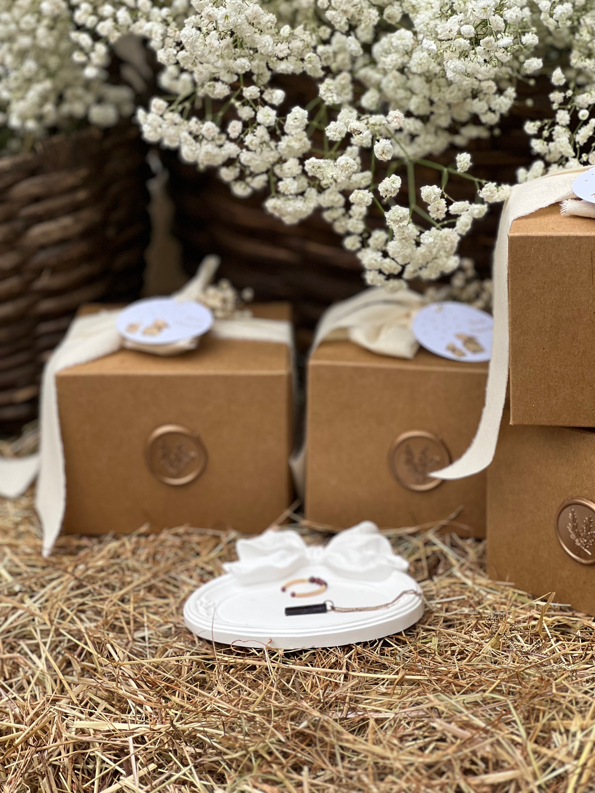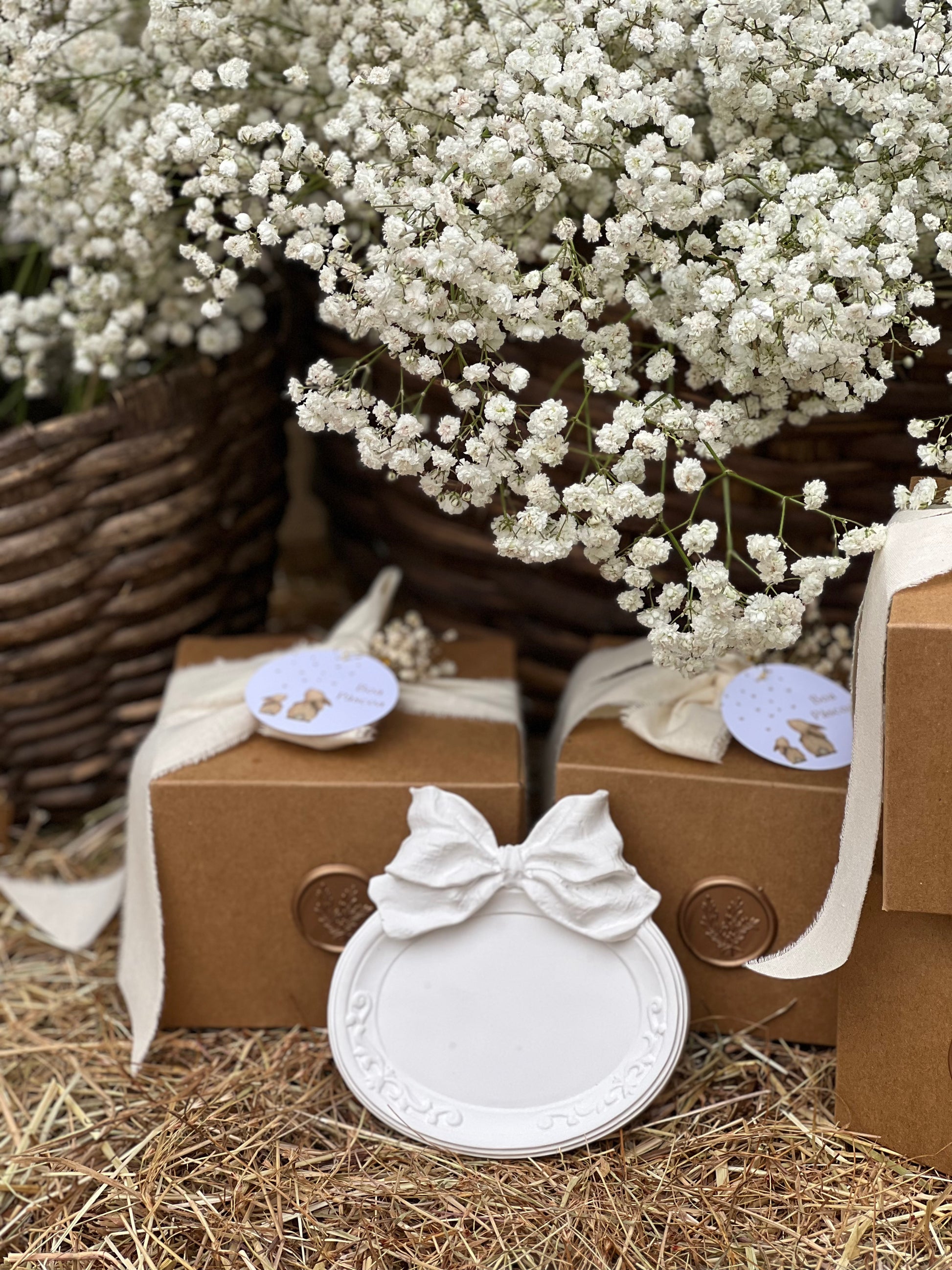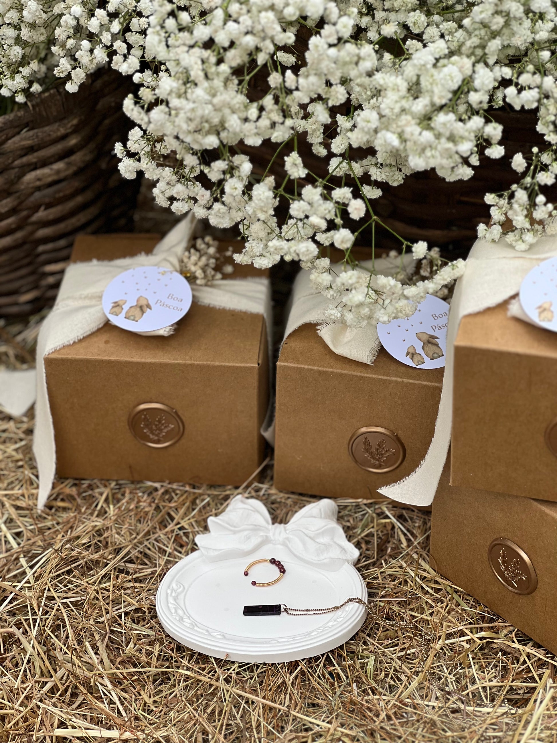 A Bandeja Oval com Laço é enviado dentro de uma caixa quadrada de cartão kraft (igual às imagens), uma fita de algodão em tom bege natural, lacre dourado e flor de vivaz. Tamanho da caixa: 9 cm de altura x 12 cm de largura |
