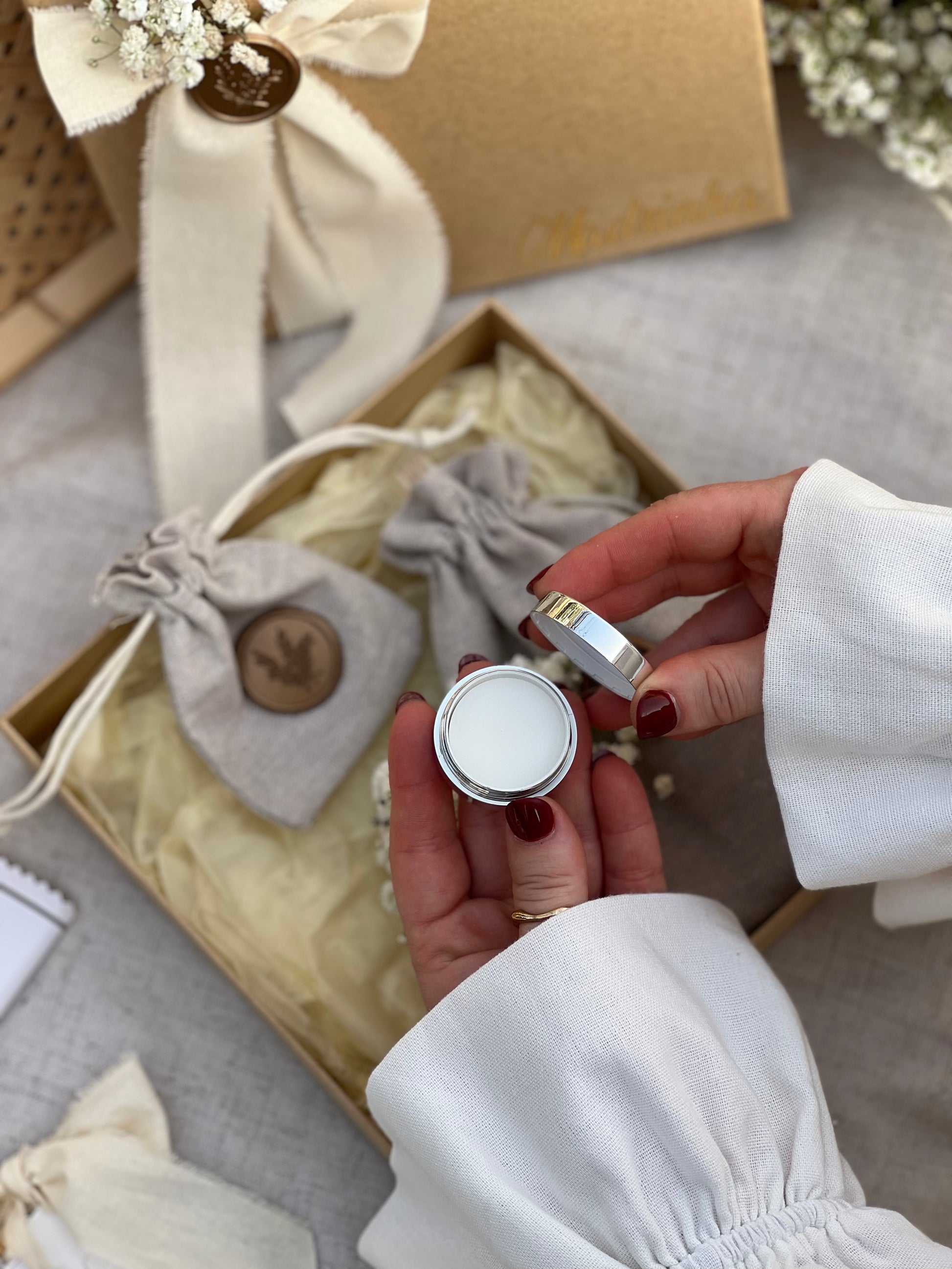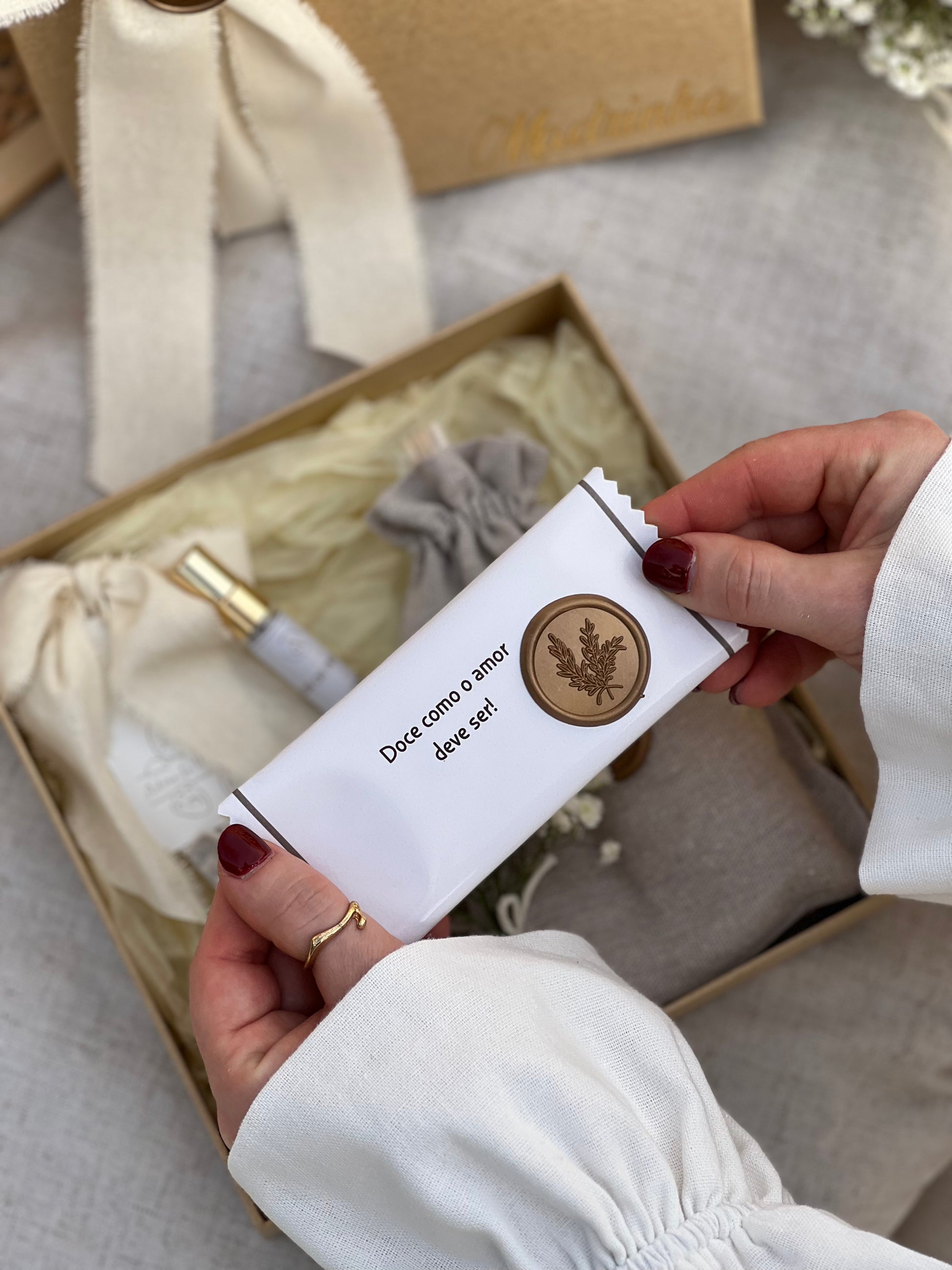 O Coffret é enviado dentro de uma caixa quadrada de cartão kraft (igual às imagens), uma fita de algodão em tom bege natural, lacre dourado, flor de vivaz com a palavra " Madrinha " em vinil dourado. Tamanho da caixa: 20 cm de altura x 20 cm de largura |