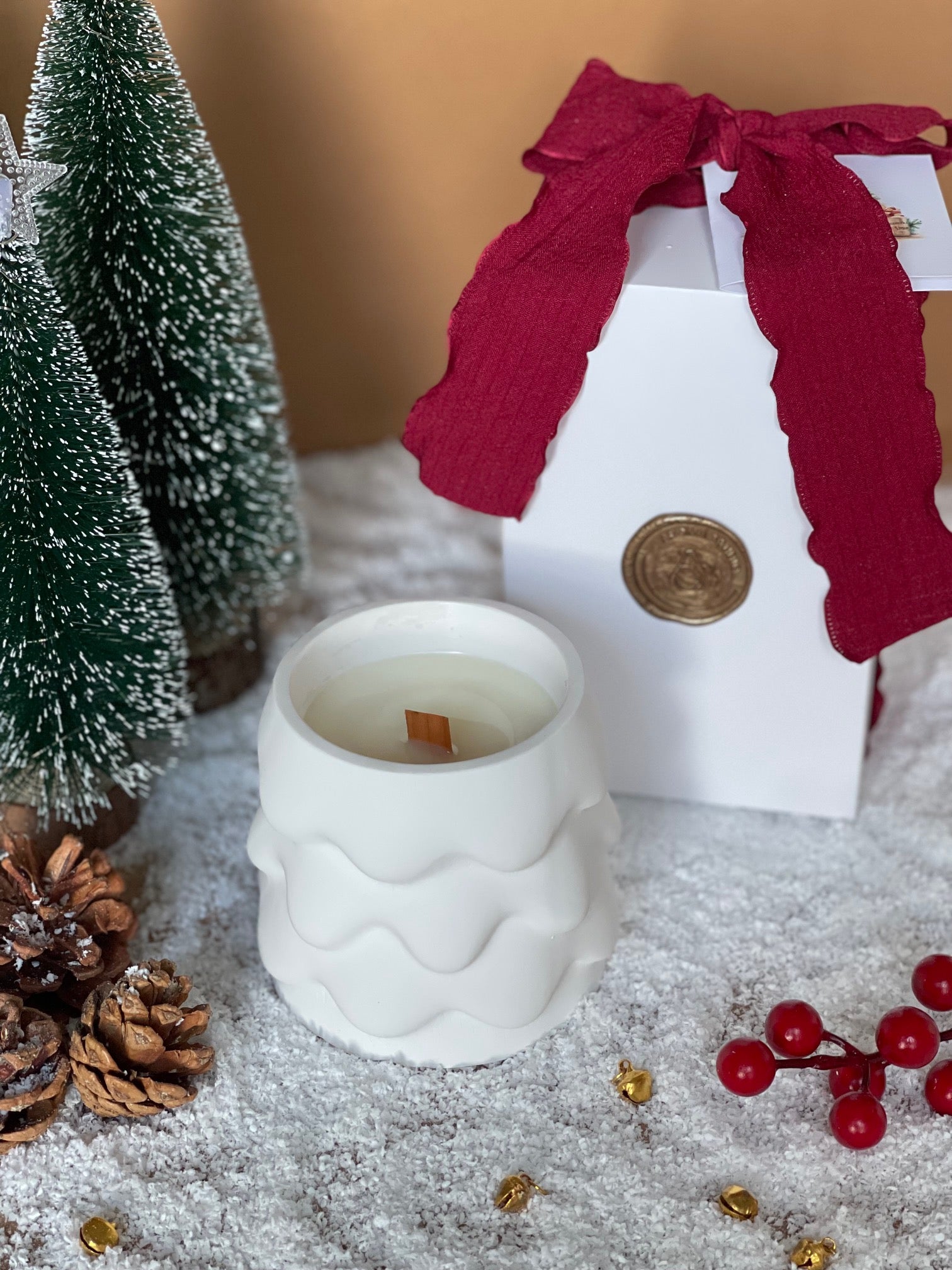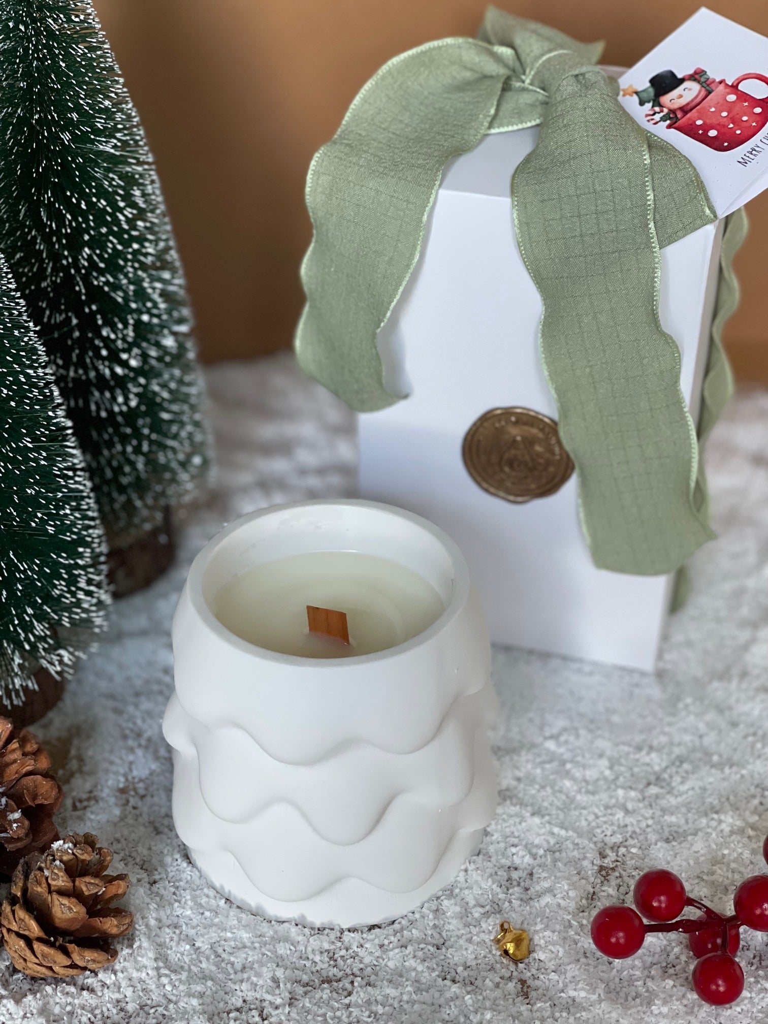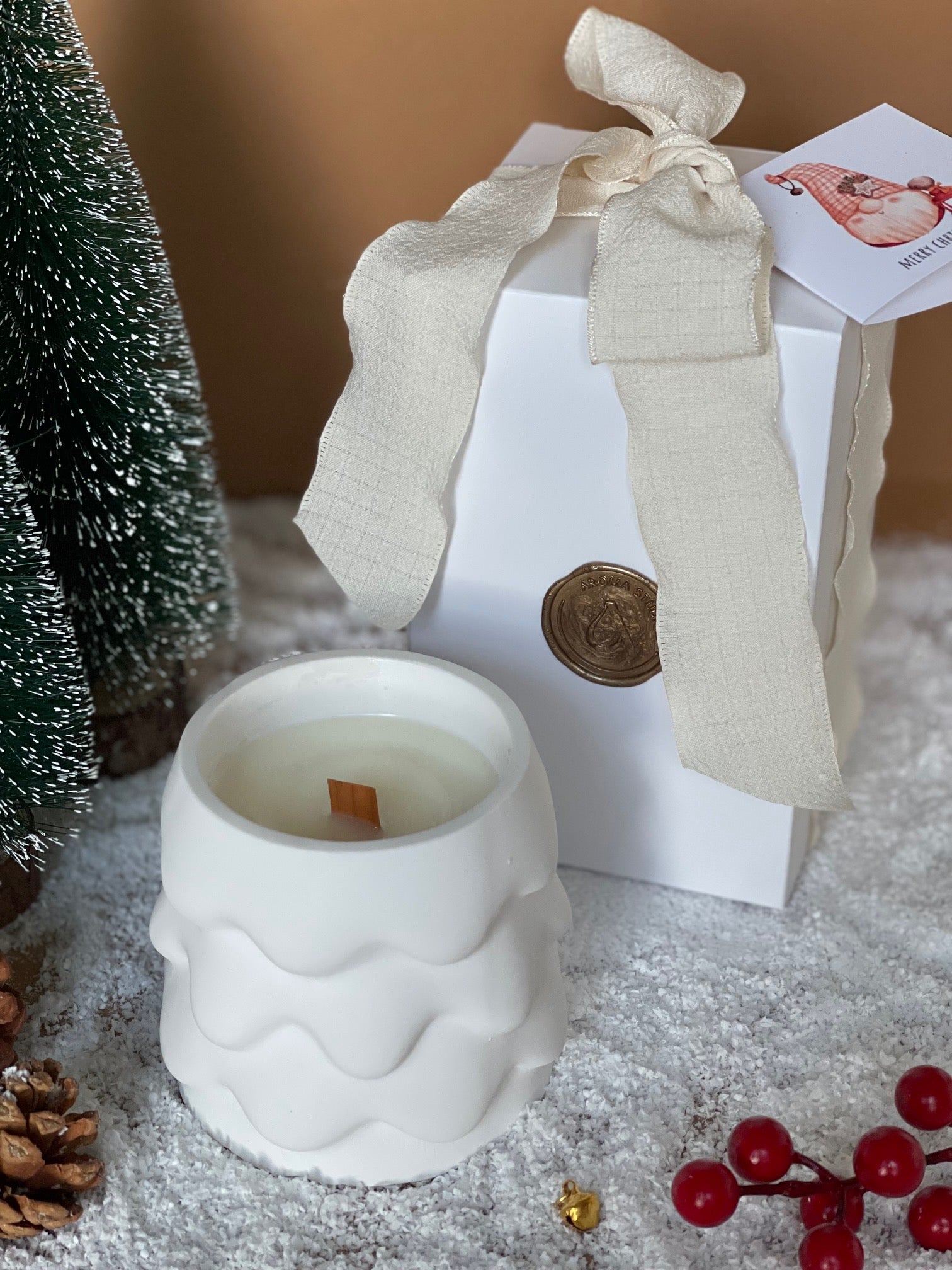 Vela em copo Floco de Neve, em gesso branco. A peça e a vela em cera de soja é perfumada é perfumada.