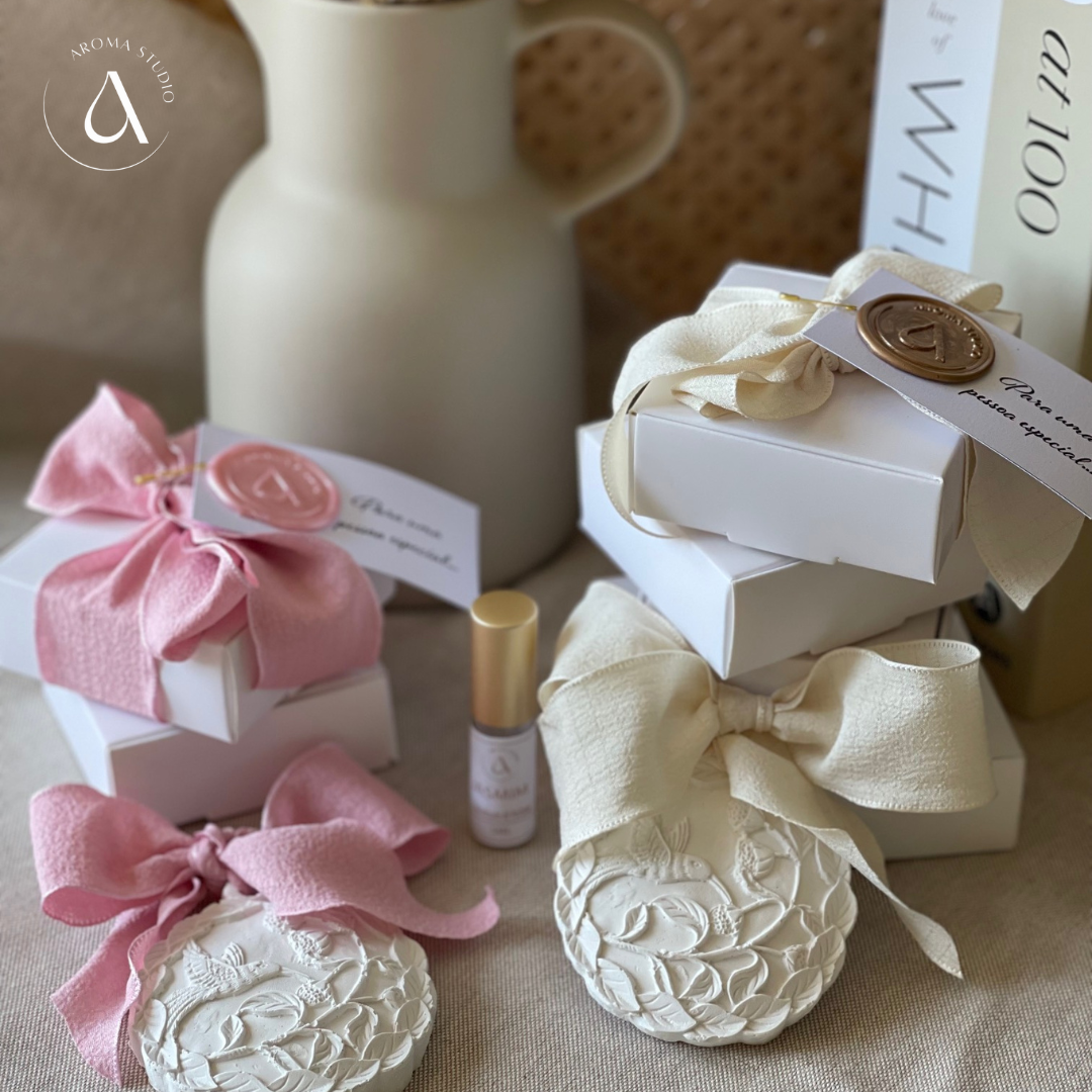 A peça em gesso é enviada dentro de uma caixa branca (igual às imagens), uma fita e um pequeno cartão personalizado (mensagem: "para uma pessoa especial" preso com um alfinete dourado. Tamanho: 8 cm de largura x 4 cm de altura A opção da caixa está sempre incluída, quer escolha a opção com frasco de perfume concentrado ou sem frasco de perfume concentrado. |