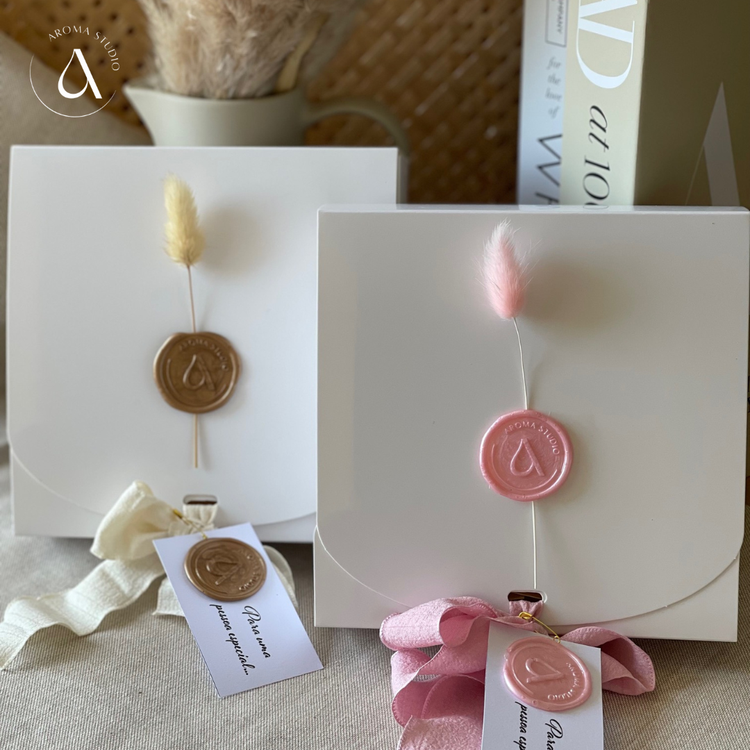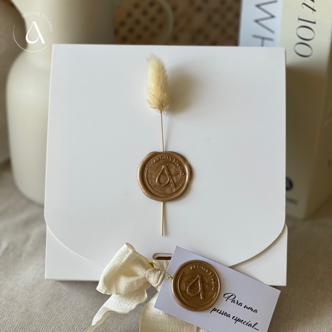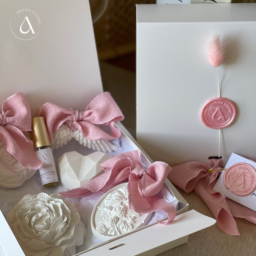 Coffrets & Presente com 5 peças em gesso perfumado e frasco de perfume concentrado de 5 ml com tampa dourada (pode escolher o aroma que desejar no ato da compra, sendo que o aroma escolhido será igual na peça em gesso e no frasco de perfume concentrado ).
