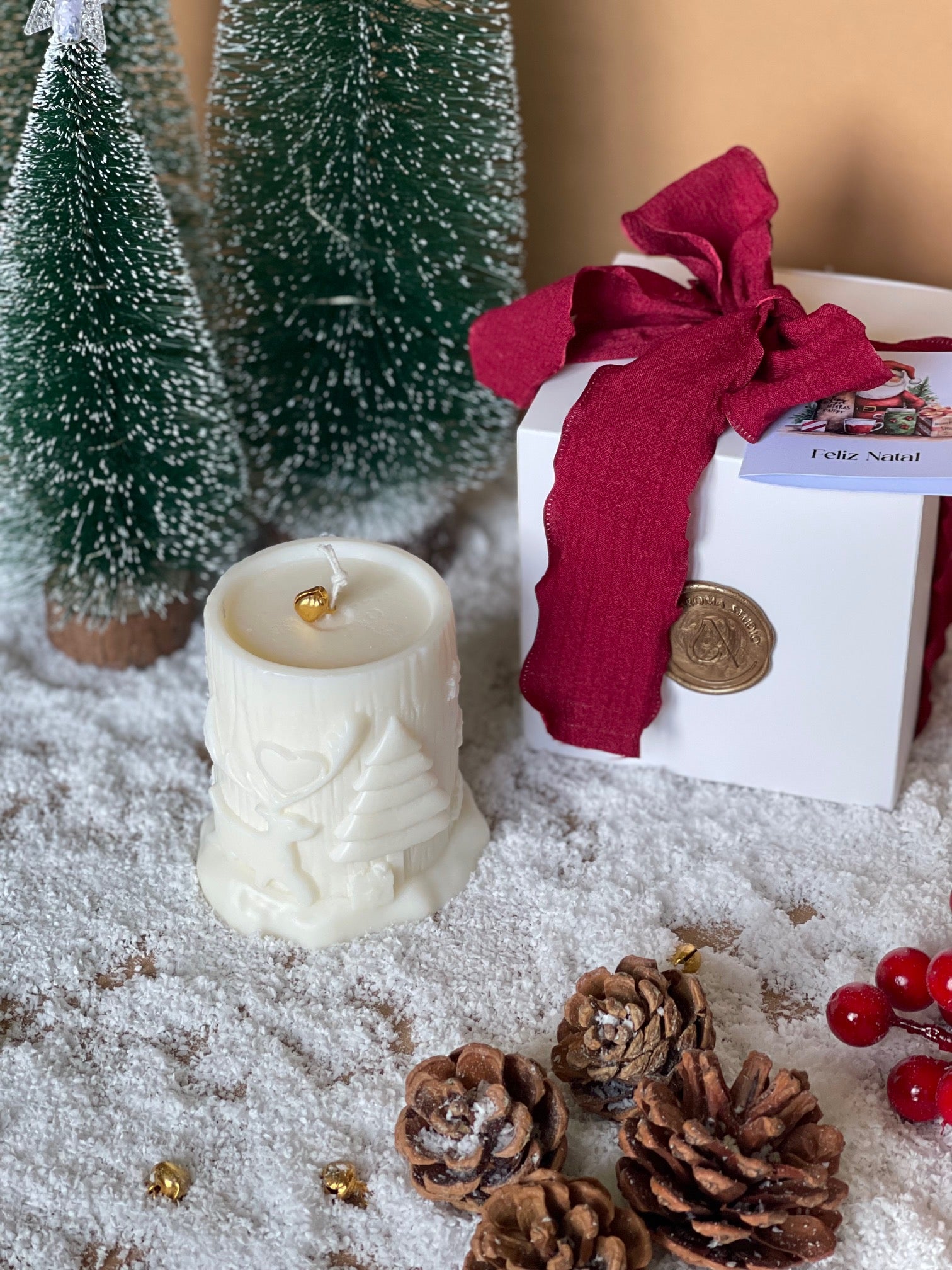 A Vela Tronco de Natal é enviada dentro de uma caixa branca (igual às imagens), com lacre dourado, uma fita e um pequeno cartão para colocar uma mensagem (no caso de querer apresentar alguém). Tamanho: 10 cm de altura x 10 cm de largura |